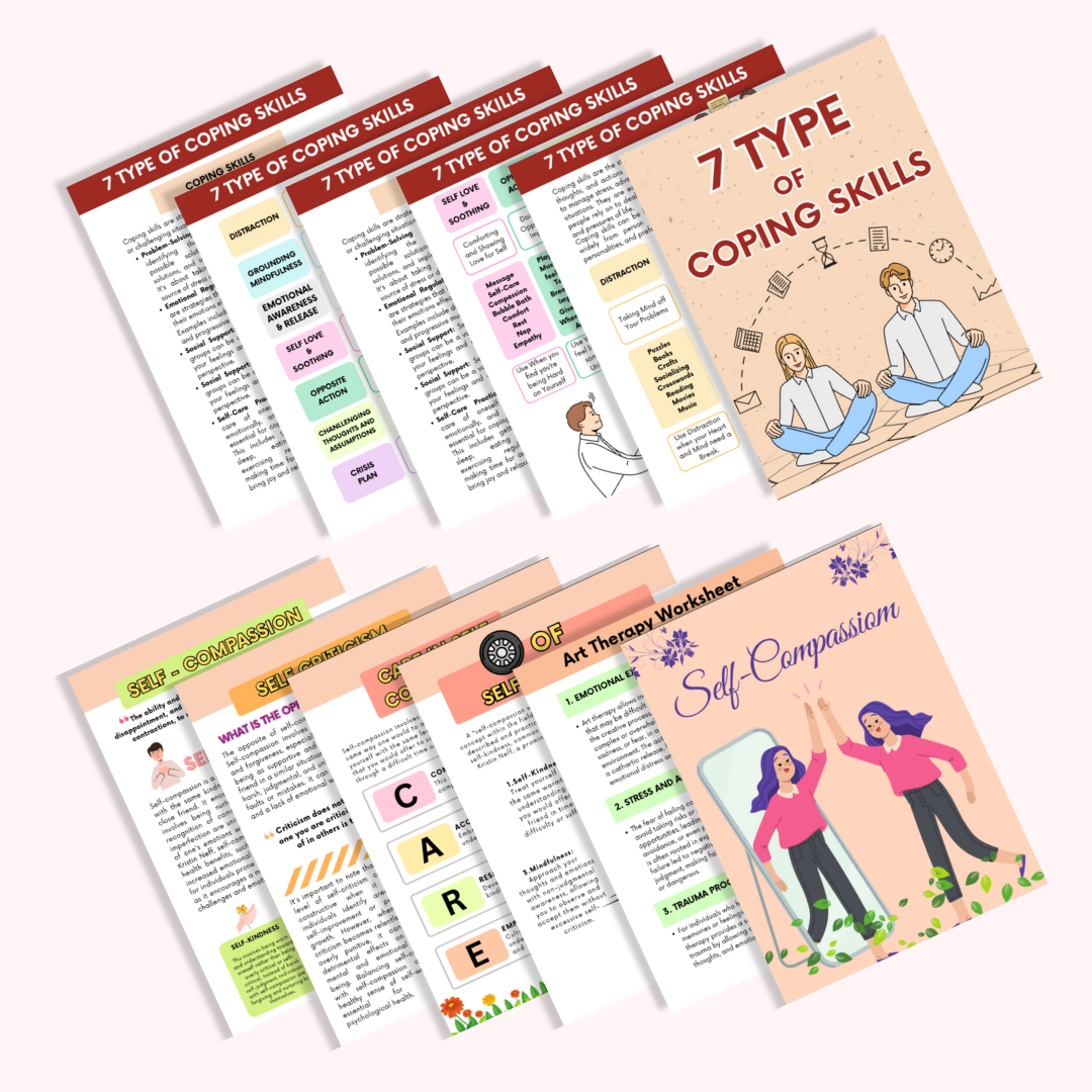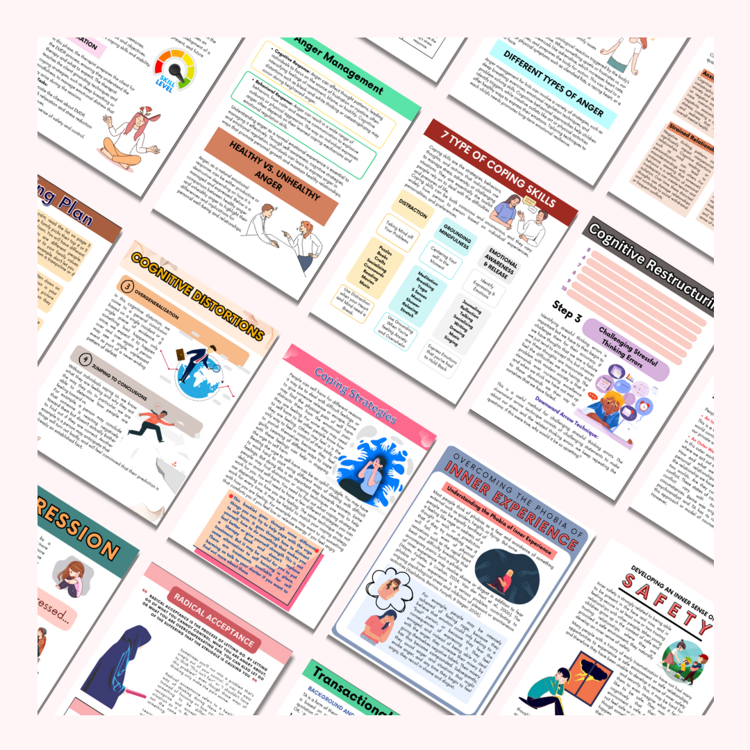 Our Trauma Bundle is designed to support healing and emotional well-being. Covering self-care, boundaries, self-esteem, anxiety, depression, cognitive distortions, and more, it provides expert-crafted tools and strategies to help you navigate challenges and foster personal growth.